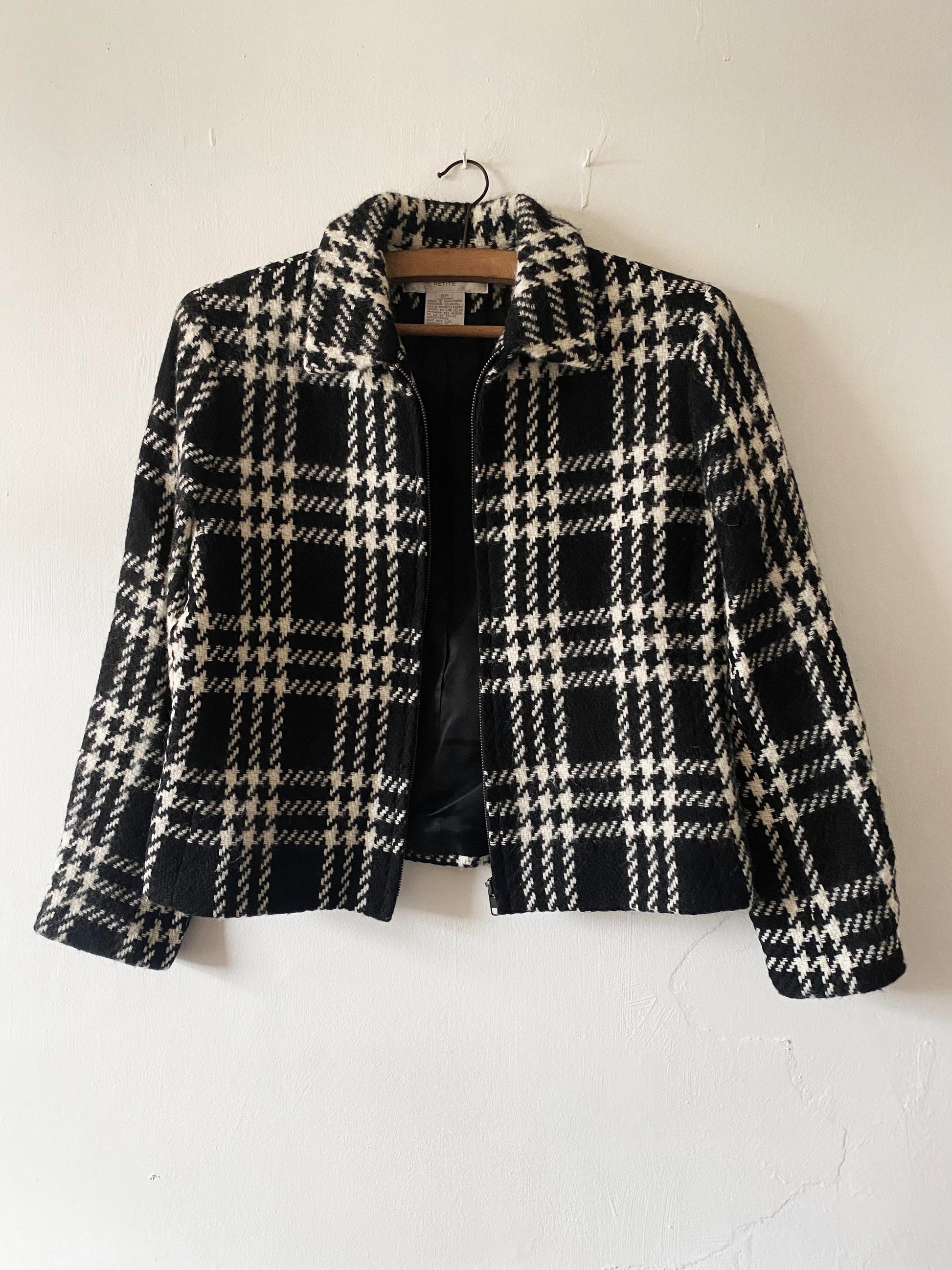 Gorgeous vintage Jones New York pure new wool woven black and white jacket. Overall perfect vintage condition, no rips to the lining, no major pulls, zip in perfect working order. This is a US size 8 which converts to a 12. This is a petite cut but the slightly cropped length makes it look more modern. I usually find wool a bit itchy but this is insanely soft.